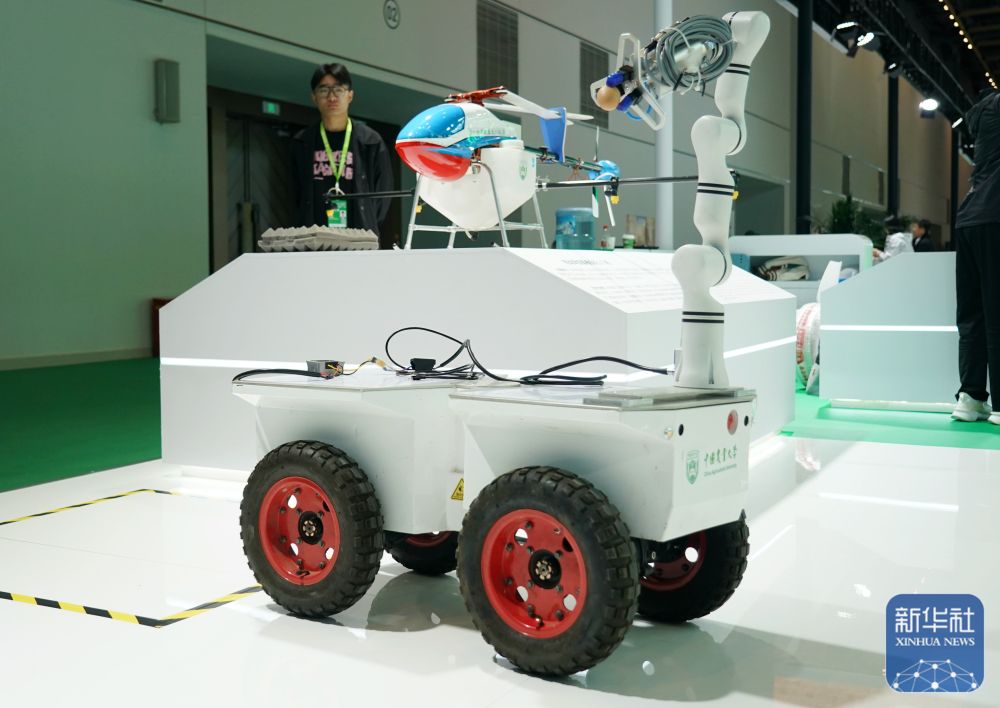 ↑这是10月11日在世界农业科技博览会拍摄的一款四驱铰接式采摘机器人。