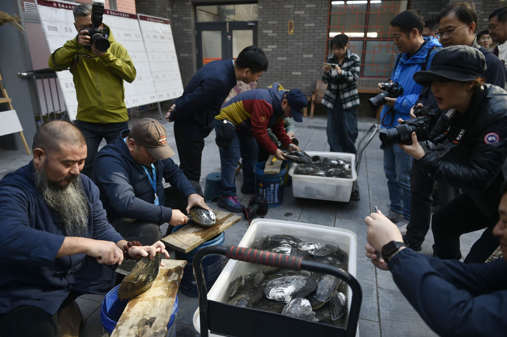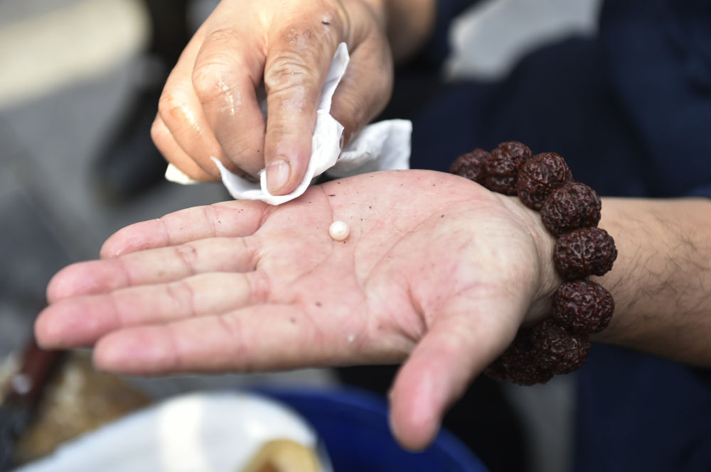 ↑10月11日,参访嘉宾在东珠珍宝博物馆体验现场“开蚌”。