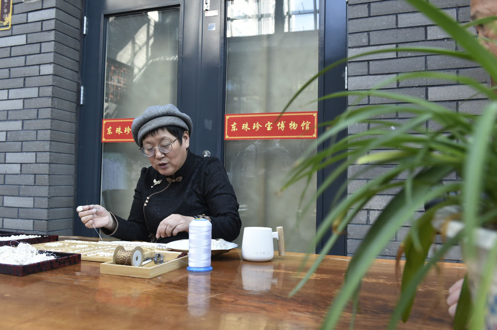 ↑10月11日,非遗传人、东珠珍宝博物馆馆长崔玮展示东珠加工技艺。