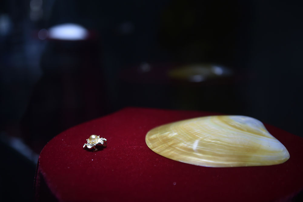 ↑10月11日,参访嘉宾在东珠珍宝博物馆展示开蚌取出的东珠。