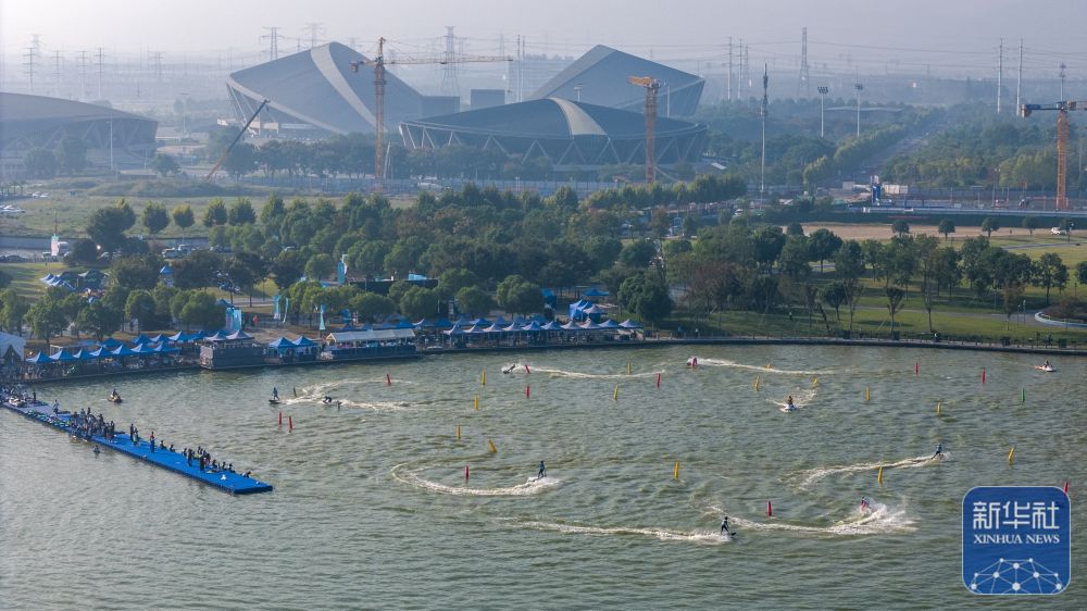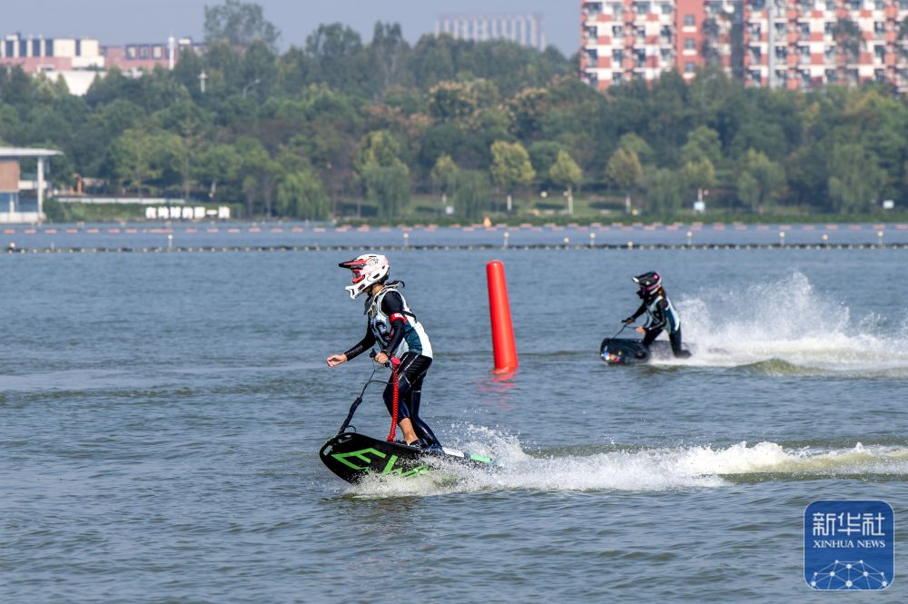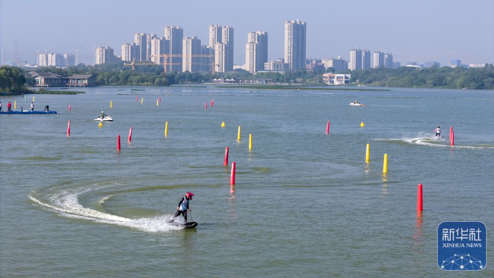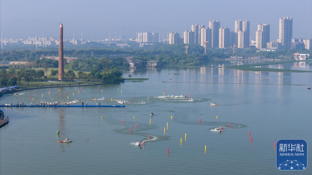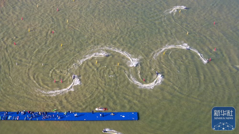 ↑10月14日,运动员在湖面上角逐(无人机照片)。