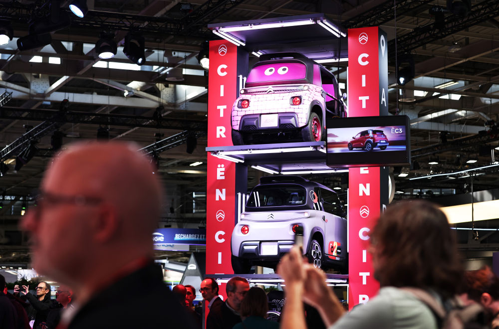 ↑10月14日,人们在法国巴黎凡尔赛门展览中心举行的2024巴黎车展媒体开放日上参观雪铁龙展台。