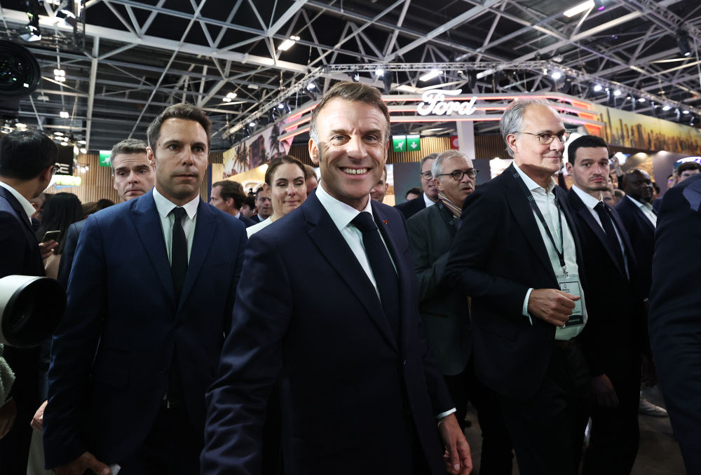 ↑10月14日,法国总统马克龙在法国巴黎凡尔赛门展览中心举行的2024巴黎车展媒体开放日上参观。