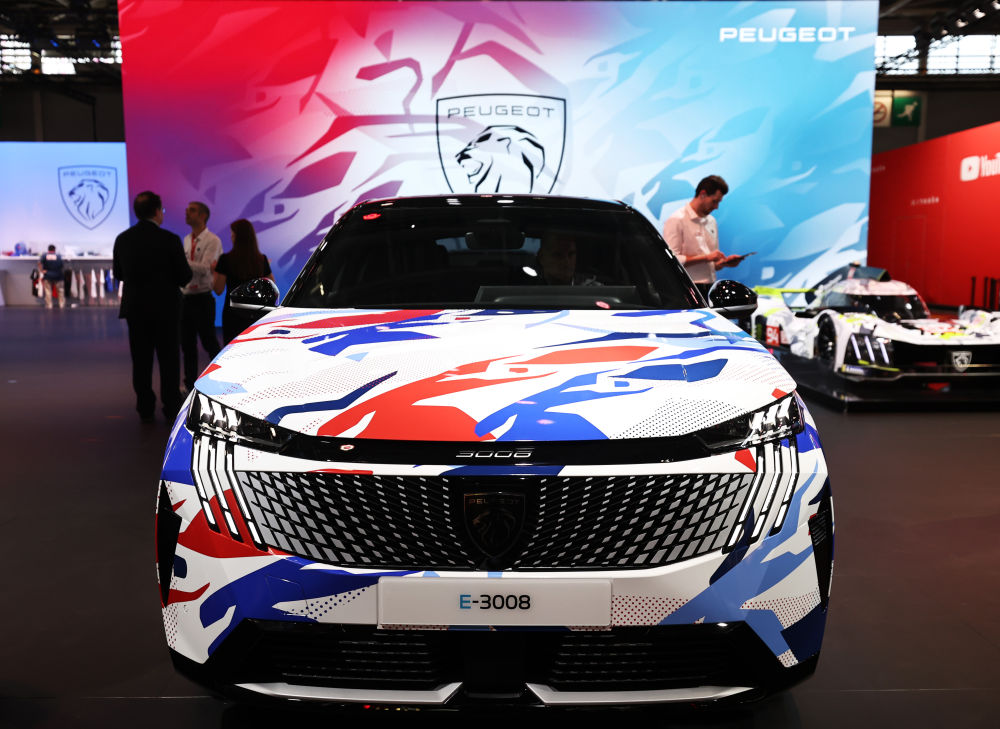 ↑10月14日,人们在法国巴黎凡尔赛门展览中心举行的2024巴黎车展媒体开放日上参观标致展台。