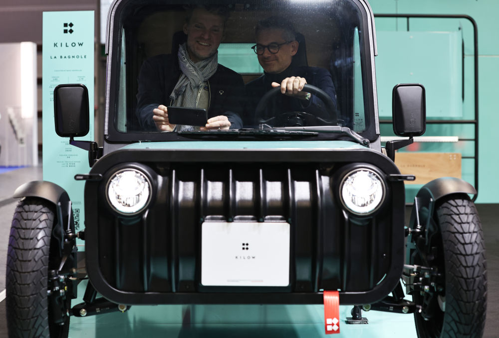 ↑10月14日,人们在法国巴黎凡尔赛门展览中心举行的2024巴黎车展媒体开放日上试乘KILOW品牌电动车。