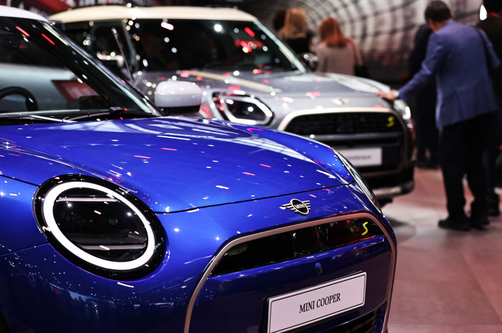 ↑10月14日,人们在法国巴黎凡尔赛门展览中心举行的2024巴黎车展媒体开放日上参观MINI COOPER展台。
