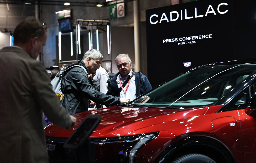 ↑10月14日,人们在法国巴黎凡尔赛门展览中心举行的2024巴黎车展媒体开放日上参观凯迪拉克展台。