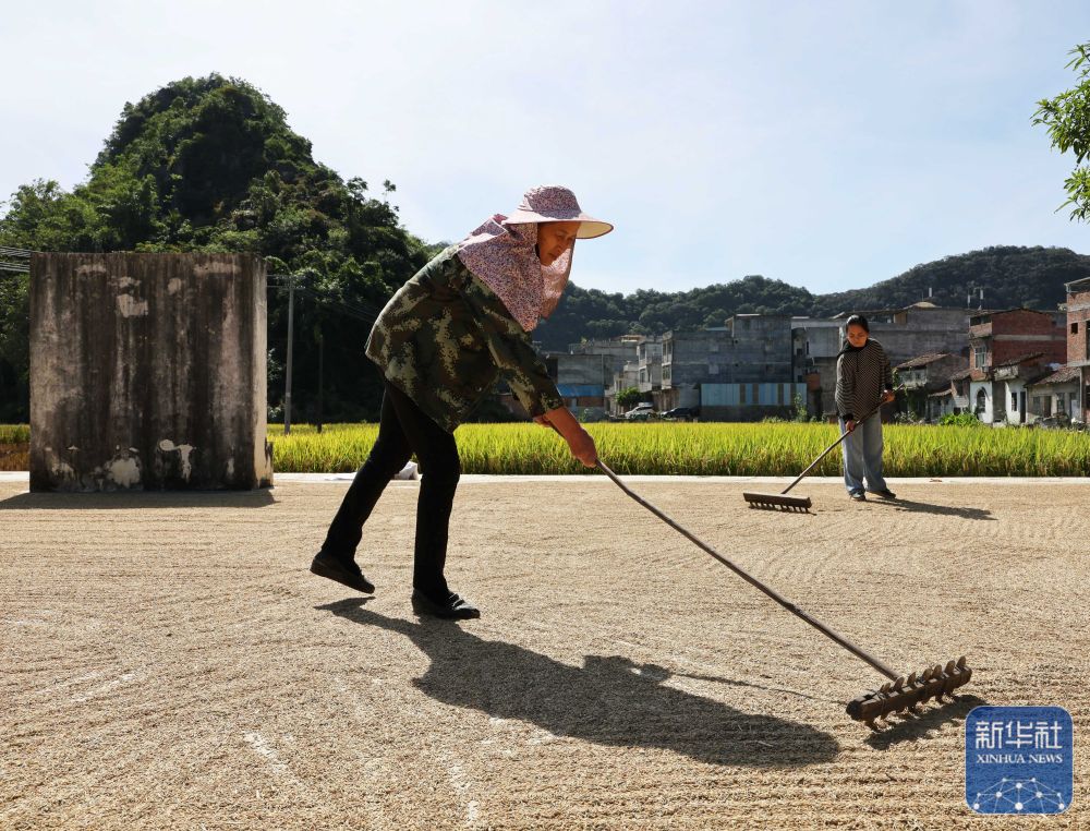 ↑ 10月24日,在天等县进结镇,村民在晾晒稻谷。