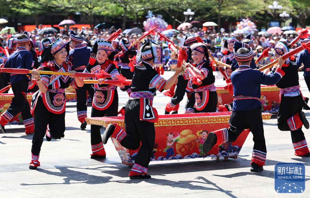 ↑ 10月23日,演员在天等县霜降节开幕活动中展示壮族打榔舞。