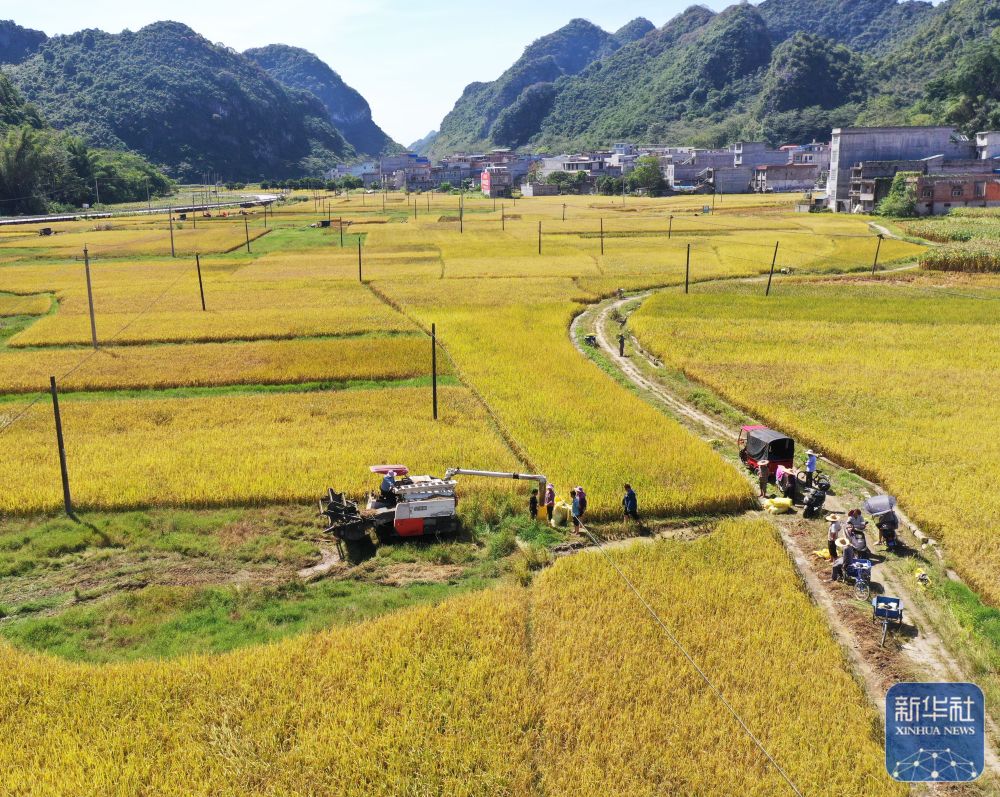 当下,广西崇左市天等县迎来晚稻收获期,到处是一派丰收景象。每年霜降时节,恰逢广西多地晚稻收获之季,人们在此期间举办传统的霜降节,欢聚一堂庆祝丰收。