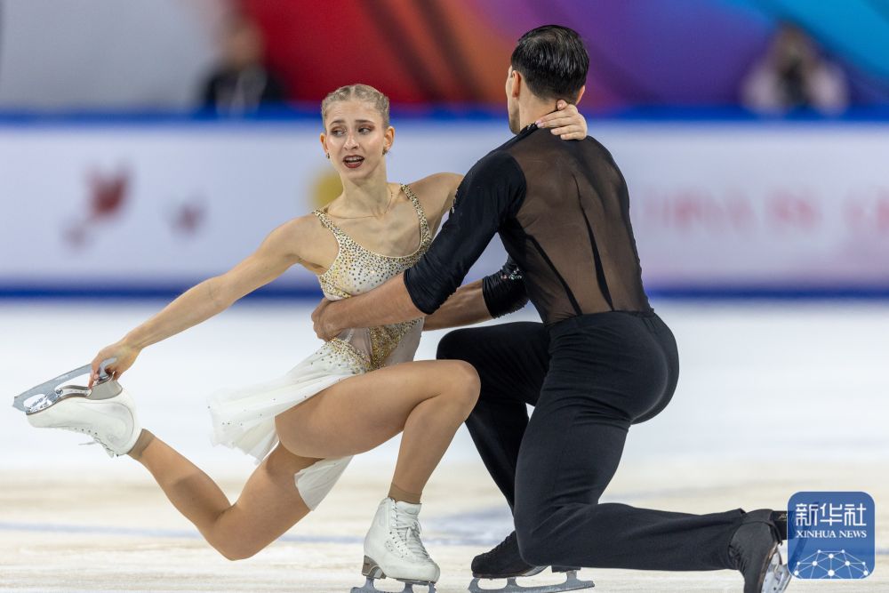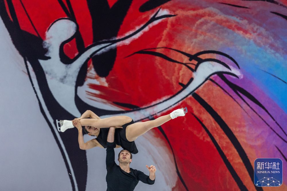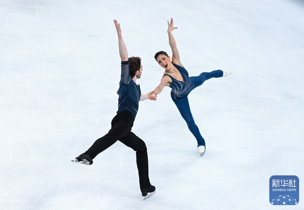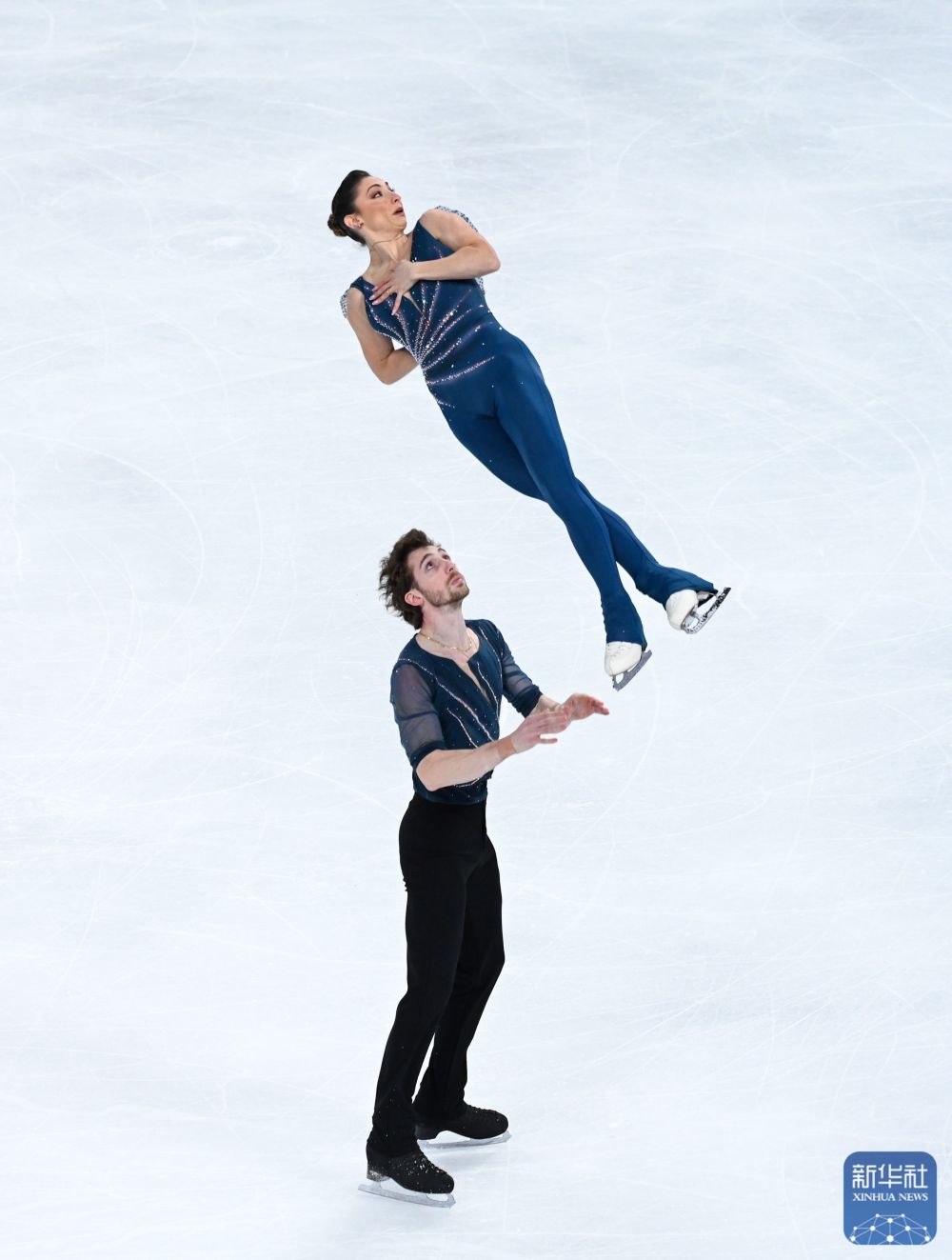 ↑加拿大组合佩雷拉(右)/米肖在双人滑自由滑比赛中。最终他们获得双人滑比赛季军。新华社记者 张子彧 摄