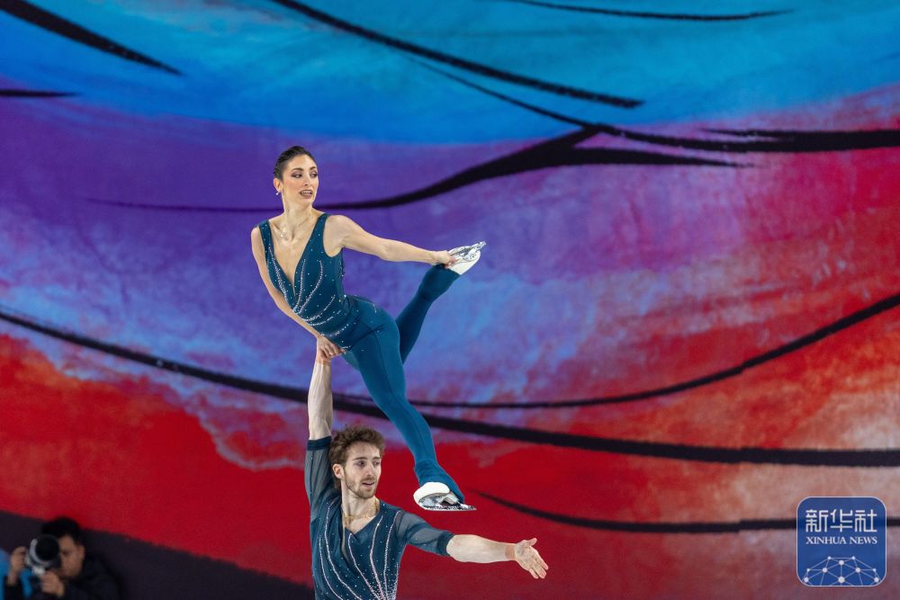 ↑意大利组合孔蒂(右)/马奇在双人滑自由滑比赛中。最终他们获得双人滑比赛冠军。新华社记者 张子彧 摄