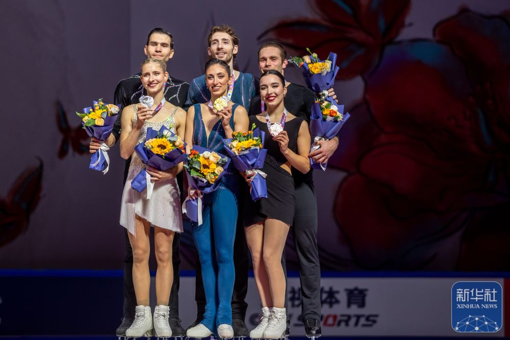 ↑冠军意大利组合孔蒂(前排中)/马奇(后排中)、亚军德国组合黑泽(前排左)/沃罗登(后排左)、季军加拿大组合佩雷拉(前排右)/米肖在双人滑颁奖仪式上合影。新华社记者 黄伟 摄