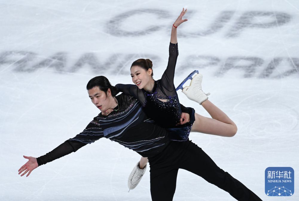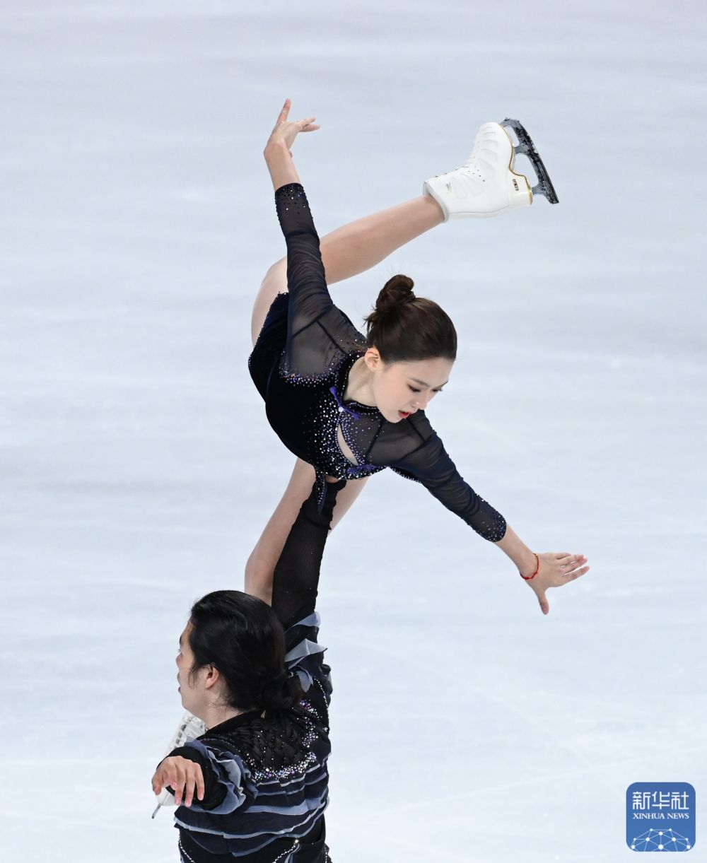 ↑中国组合王瑀晨(上)/朱磊在双人滑自由滑比赛中。最终他们获得双人滑比赛第八名。新华社记者 张子彧 摄