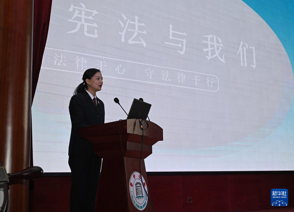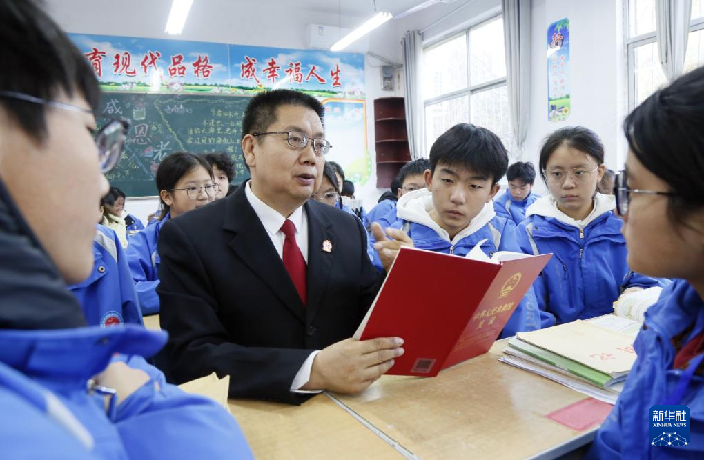 12月3日,山东省枣庄市台儿庄区人民法院的法官为学生讲解宪法知识。新华社发(贾礼章摄)