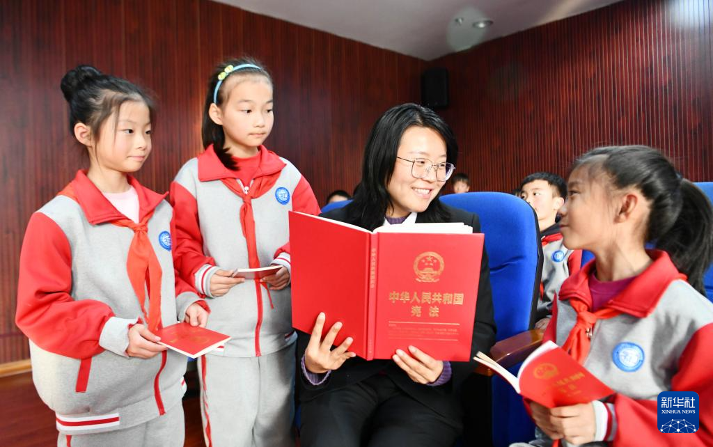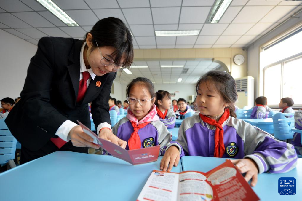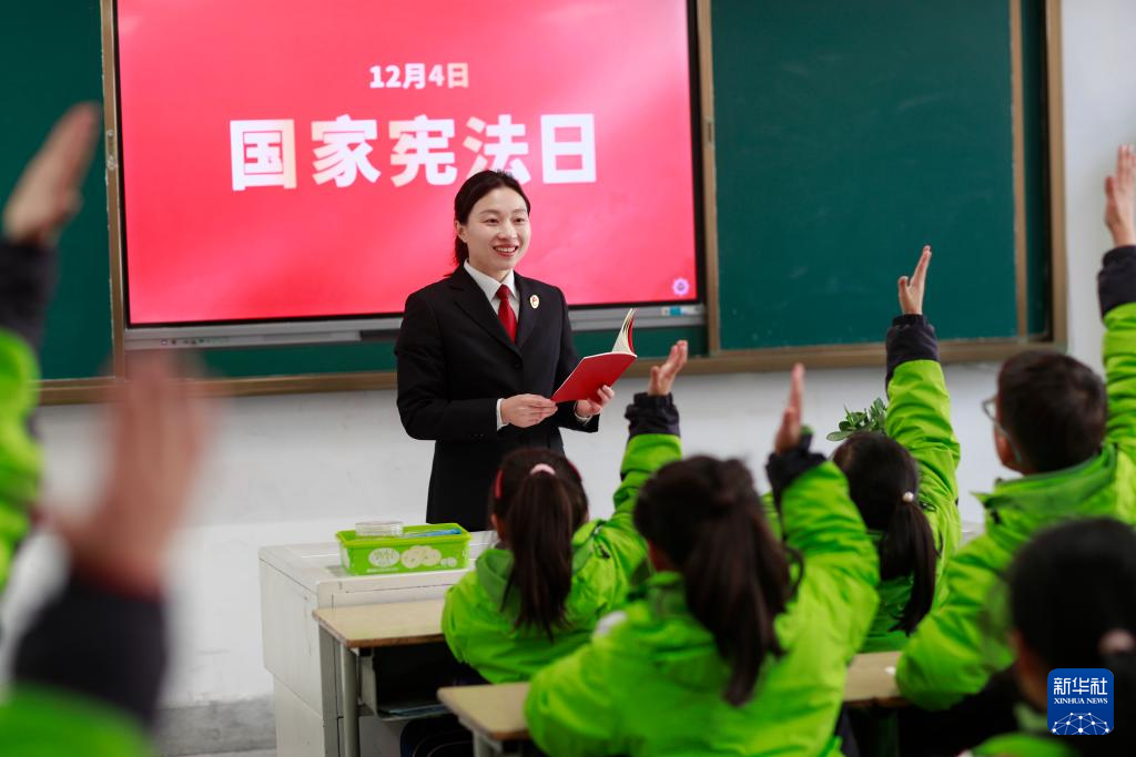 12月3日,在江苏省兴化市林湖中心校,兴化市人民检察院法治宣讲团的工作人员为学生讲解宪法知识。新华社发(周社根摄)