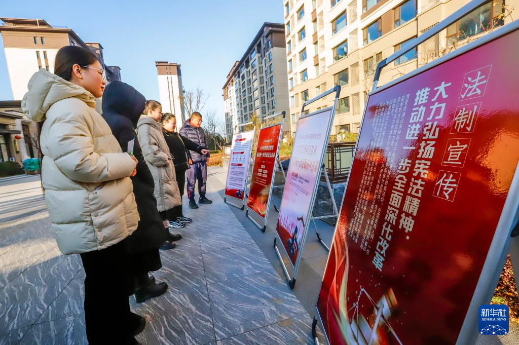 12月3日,河北省遵化市华明路街道的社区居民在参观宪法知识宣传展板。新华社发(刘满仓摄)