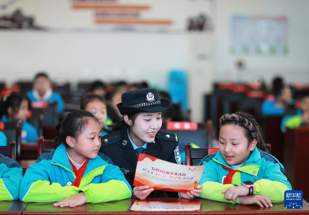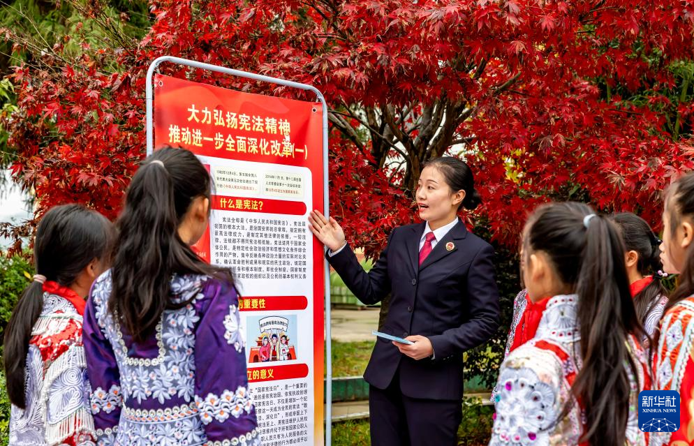 12月3日,贵州省黔西市人民检察院的检察干警在新仁苗族乡化竹小学为学生普及宪法知识。新华社发(范晖摄)