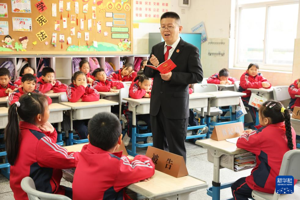12月3日,在浙江省湖州市德清县乾元镇中心小学的模拟法庭上,法官为学生们讲解宪法知识。新华社发(倪立芳摄)
