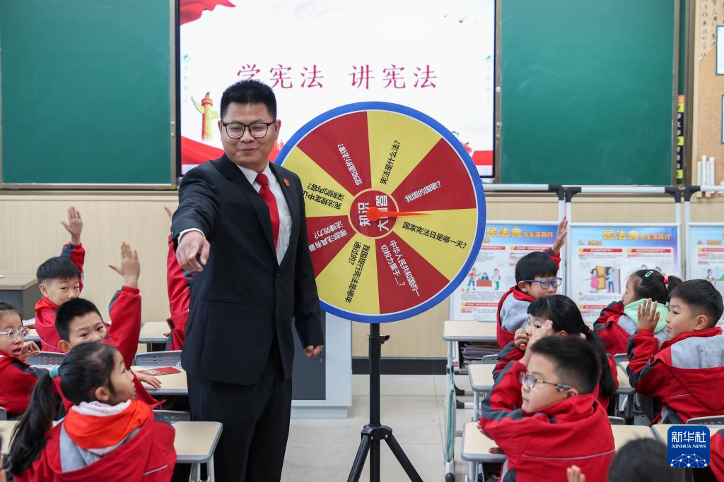 12月3日,在浙江省湖州市德清县雷甸镇中心小学,德清县人民法院雷甸人民法庭工作人员通过知识大转盘为学生普及宪法知识。新华社发(姚海翔摄)