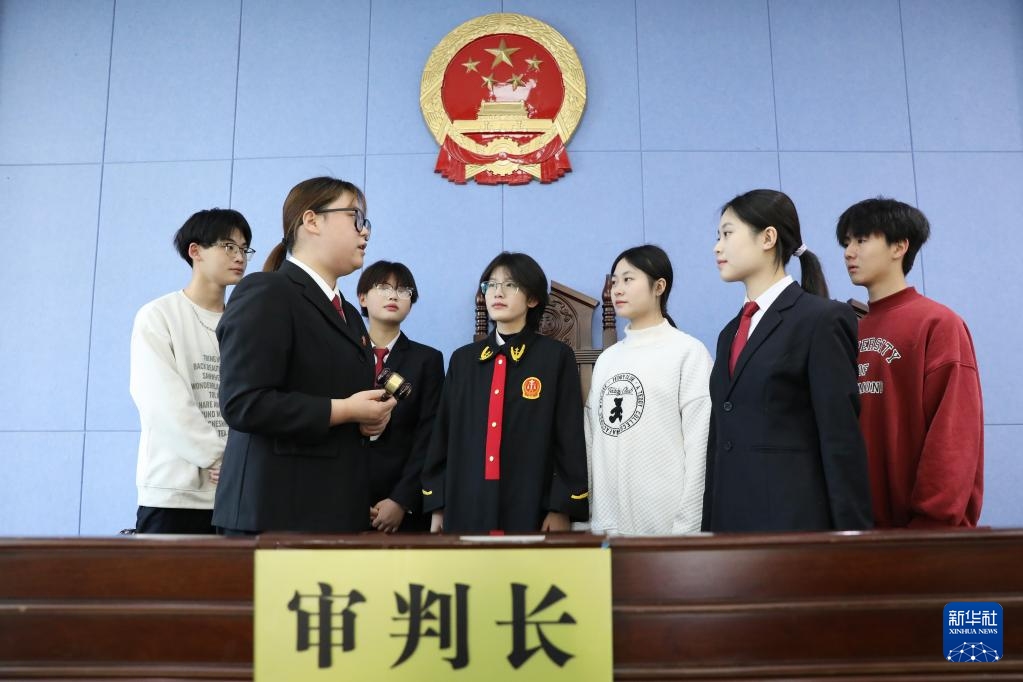 12月3日,河南省焦作市温县人民法院法官职雨洁为温县职教中心学生讲解法槌的作用。新华社发(徐宏星摄)