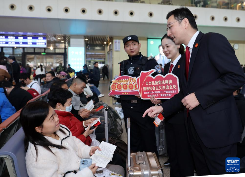 12月3日,武汉铁路运输中级法院法官在武汉火车站为旅客宣传宪法知识。新华社发(赵军摄)