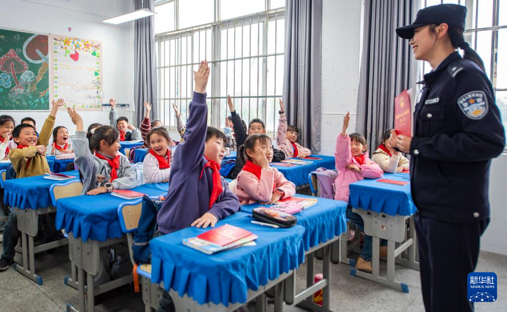 12月3日,在安徽省芜湖市繁昌区孙村镇中心小学,民警为小学生讲解宪法知识。新华社发(肖本祥摄)