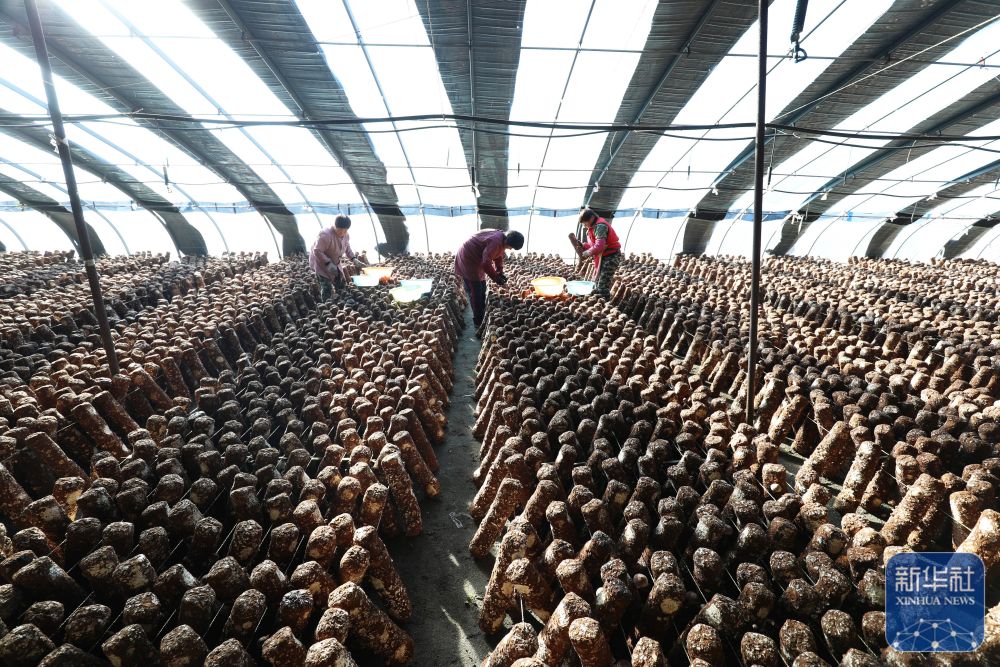 12月21日,河北省唐山市丰润区任各庄镇新庄子村农民在大棚内采摘香菇。新华社发(朱大勇摄)