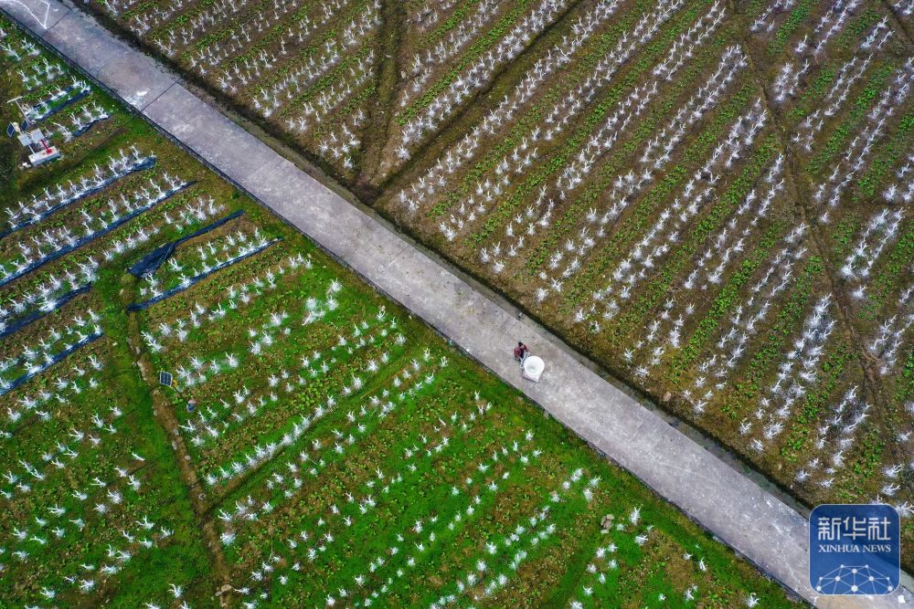 12月21日,村民在重庆市黔江区太极镇李子村蚕桑基地忙碌(无人机照片)。新华社发(杨敏摄)