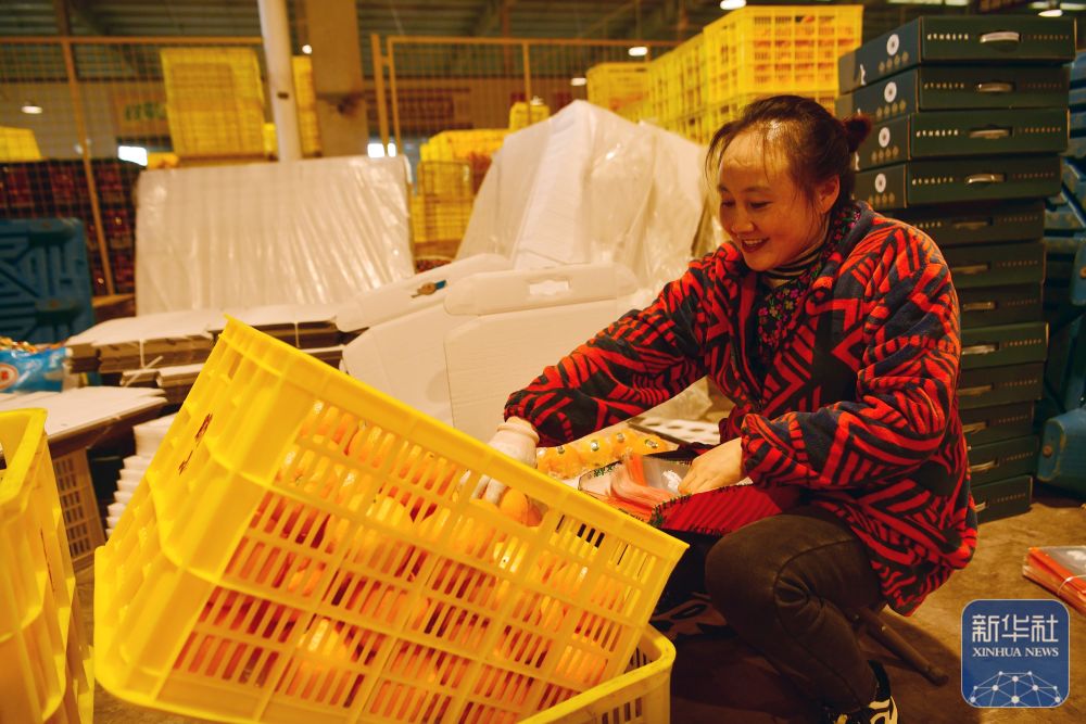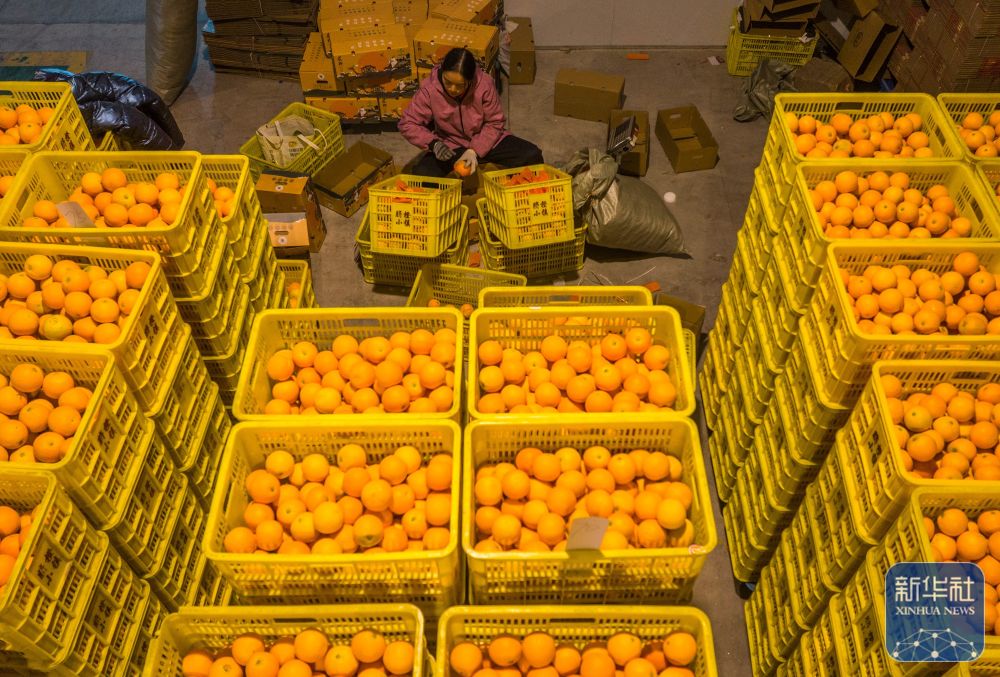 12月21日,工人在湖北省宜昌市秭归县脐橙小镇数字化电商中心包装鲜橙。新华社发(王辉富摄)