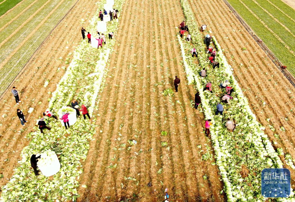 12月21日,山东省临沂市平邑县地方镇农民在田间收获大白菜(无人机照片)。新华社发(武纪全摄)