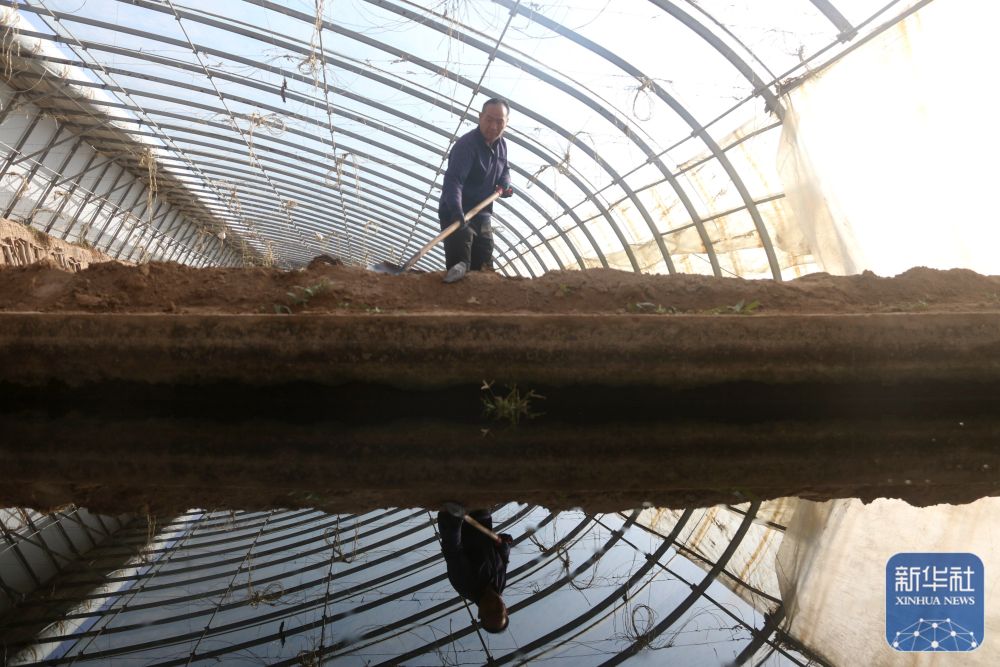 12月21日,农民在甘肃省敦煌市转渠口镇雷家墩村的温室中平整土地,为种植蔬菜做好准备。新华社发(张晓亮摄)
