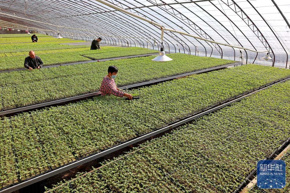 12月21日,山东省枣庄市市中区兴亮蔬菜农民专业合作社的农民在育苗大棚里管护西红柿秧苗。新华社发(孙中喆摄)