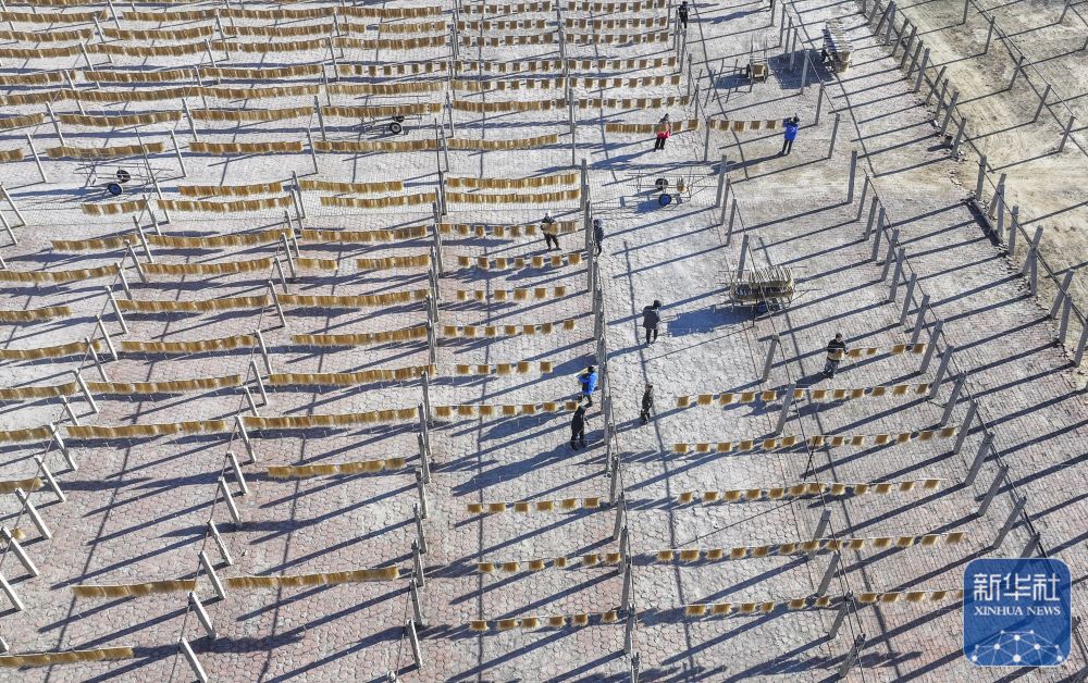 12月21日,农民在河北省遵化市一家粉条加工专业合作社晒场晾晒粉条(无人机照片)。新华社发(刘满仓摄)