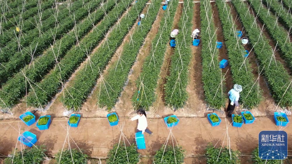 12月21日,云南省景洪市勐罕镇曼听村农民在采收辣椒(无人机照片)。新华社发(李云生摄)