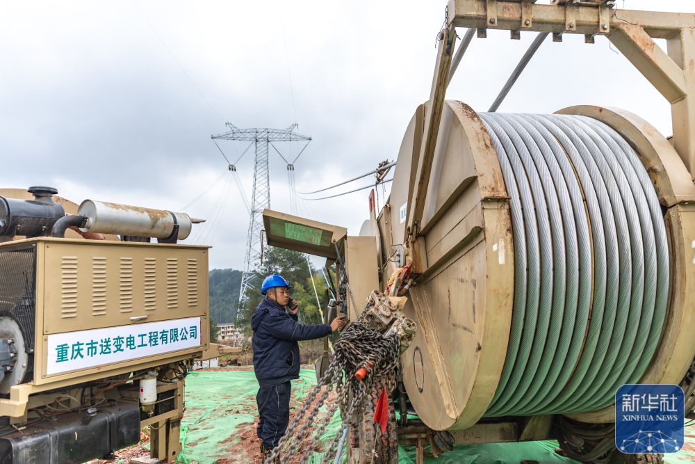1月8日,在重庆市渝北区,重庆送变电公司施工人员在哈密至重庆±800千伏特高压直流输电线路工程重庆段现场施放导线。新华社记者 黄伟 摄