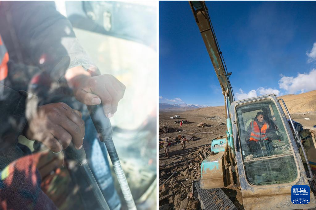 拼版照片:左图为中国安能救援队的救援人员白玛旺加的手;右图为白玛旺加在定日县长所乡古荣村操纵挖掘机清理废墟(1月13日摄)。新华社记者 丁增尼达 摄