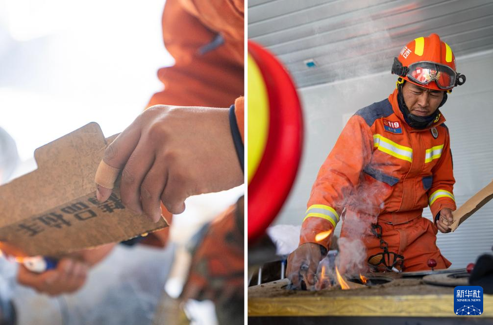 拼版照片:左图为消防员桑丹群培的手;右图为桑丹群培在定日县野江村板房内为群众生火取暖(1月13日摄)。新华社记者 丁增尼达 摄