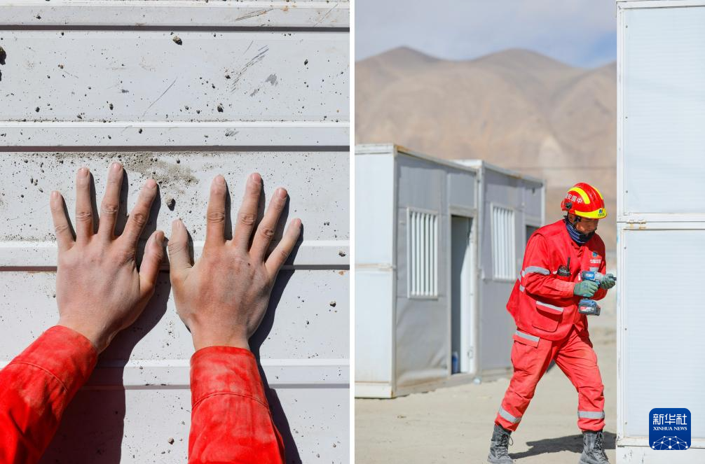拼版照片:左图为救援人员谢志奇的手;右图为谢志奇在定日县长所乡玉白村的受灾群众安置点安装板房(1月12日摄)。新华社记者 沈伯韩 摄