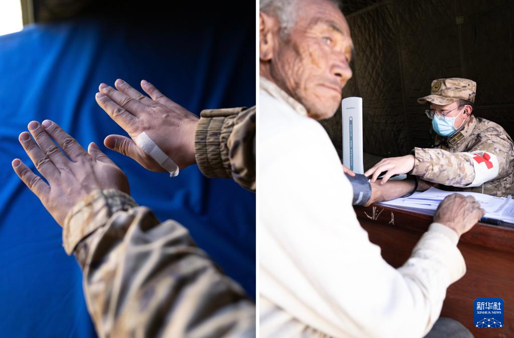 拼版照片:左图为武警西藏总队医院医疗队队员胡鑫的手;右图为胡鑫在定日县长所乡森嘎村为村民测量血压(1月13日摄)。新华社记者 丁增尼达 摄