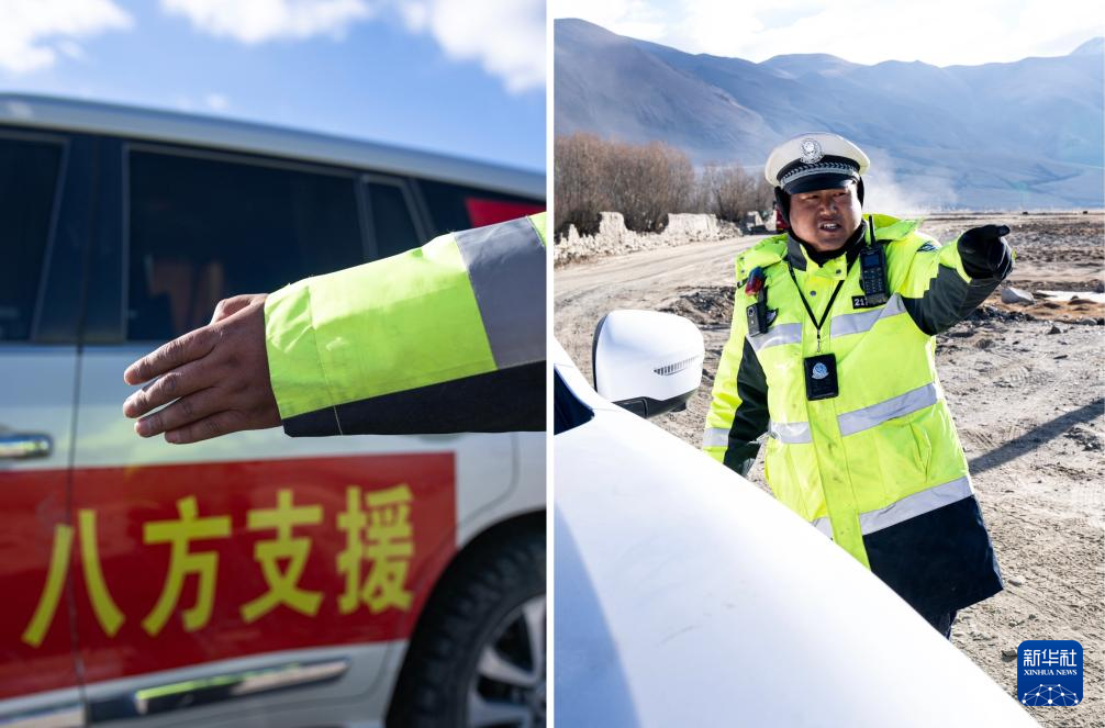 拼版照片:左图为日喀则市公安局交警支队米玛次仁的手;右图为米玛次仁在定日县长所乡前往震中的公路旁执勤(1月13日摄)。新华社记者 丁增尼达 摄