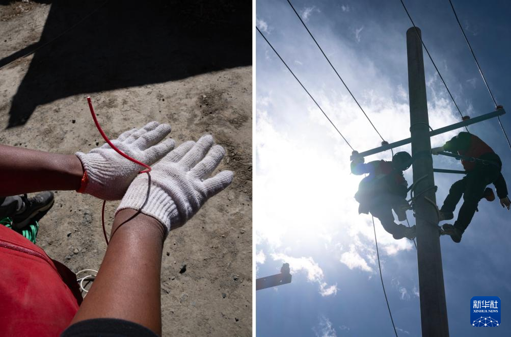 拼版照片:左图为西藏旺雄电力安装工程有限公司电力工人扎西多拉的手;右图为扎西多拉(右)在定日县长所乡森嘎村抢修电路(1月12日摄)。新华社记者 丁增尼达 摄