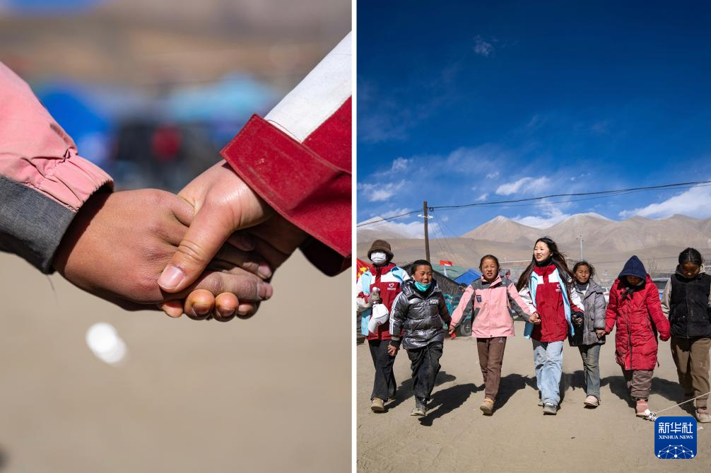 拼版照片:左图为西部计划志愿者周涟笛牵着灾区孩子的手;右图为周涟笛(中)在定日县长所乡森嘎村为孩子们进行心理疏导(1月13日摄)。新华社记者 丁增尼达 摄