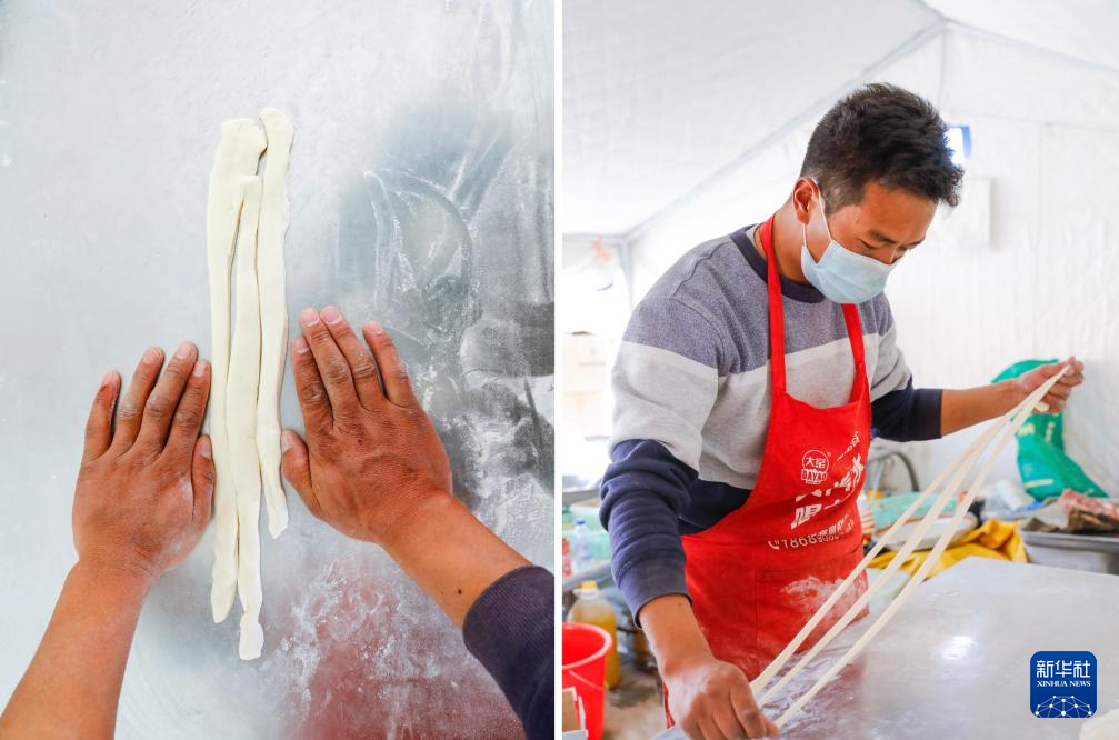 拼版照片:左图为日喀则市江孜县啊香啦炒面馆的合伙人尼玛旦增的手;右图为尼玛旦增在定日县长所乡玉白村的安置点为受灾群众做面食(1月12日摄)。新华社记者 沈伯韩 摄