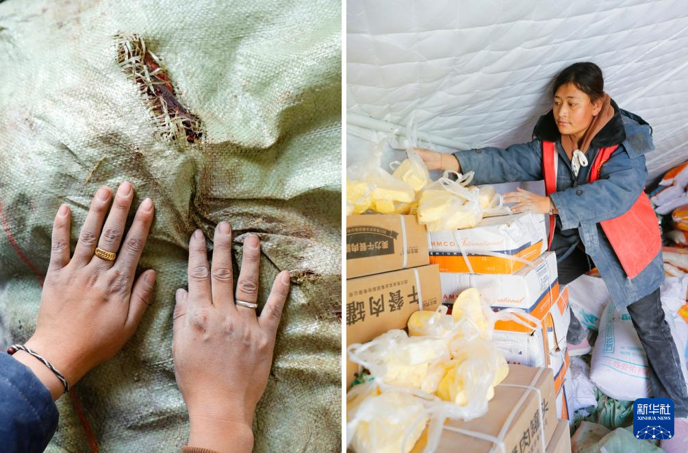 拼版照片:左图为定日县长所乡玉白村驻村干部巴姆的手;右图为巴姆在定日县长所乡玉白村的受灾群众安置点清点捐赠来的酥油(1月12日摄)。新华社记者 沈伯韩 摄