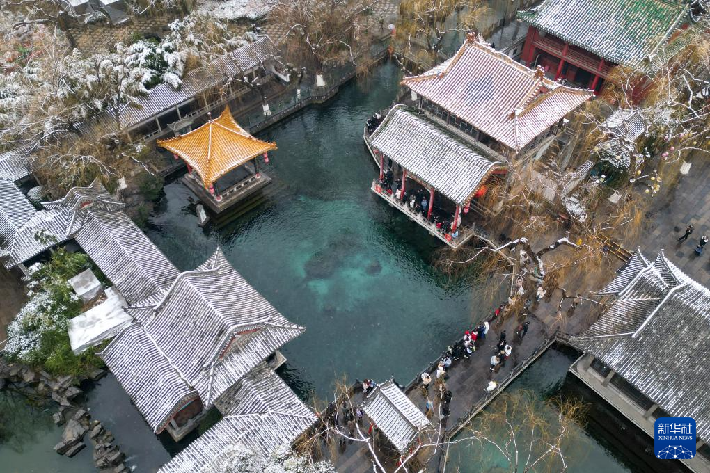 1月26日,人们在山东省济南市趵突泉公园观赏雪景(无人机照片)。新华社发(郝鑫城摄)