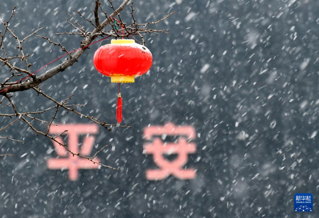 1月26日,山东省枣庄市山亭区太清湖广场树上的红灯笼落满雪花。新华社发(李宗宪摄)