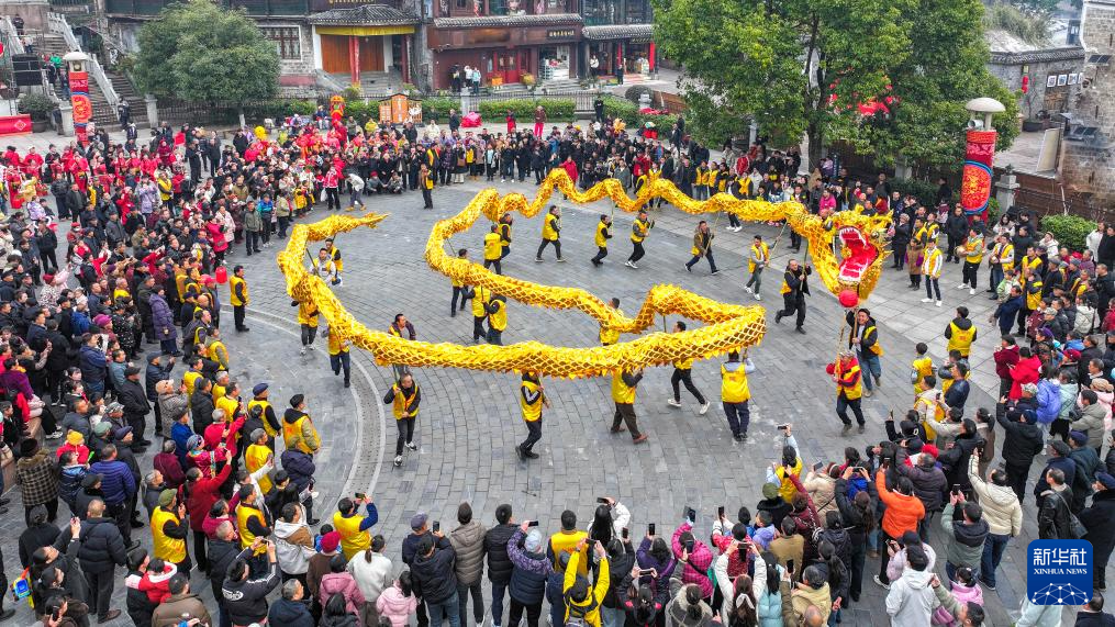 1月29日,在湖南省湘西土家族苗族自治州凤凰县文化广场,群众舞龙欢庆新年(无人机照片)。新华社发(周秀鱼春摄)