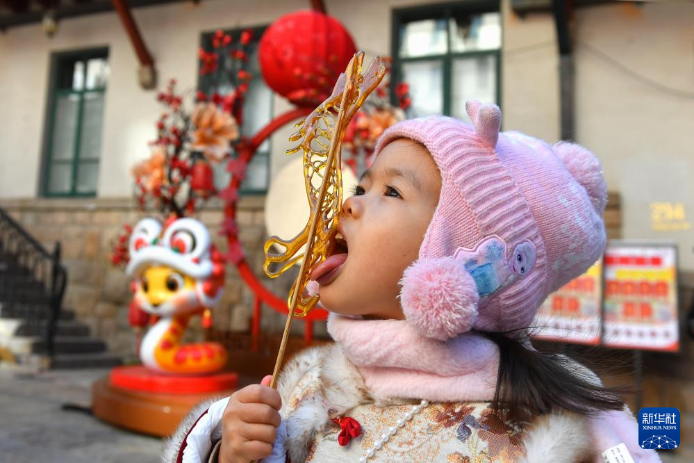 1月29日,在山东省青岛市市北区大鲍岛文化休闲街区举办的“里院新年”迎春活动上,一名小朋友在品尝糖画。新华社发(王海滨摄)