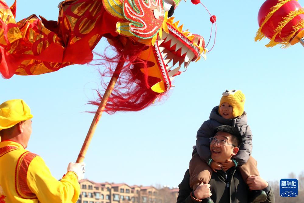 1月29日,一名家长带着孩子在山东省安丘市青云山民俗游乐园观看舞龙表演。新华社发(李海涛摄)